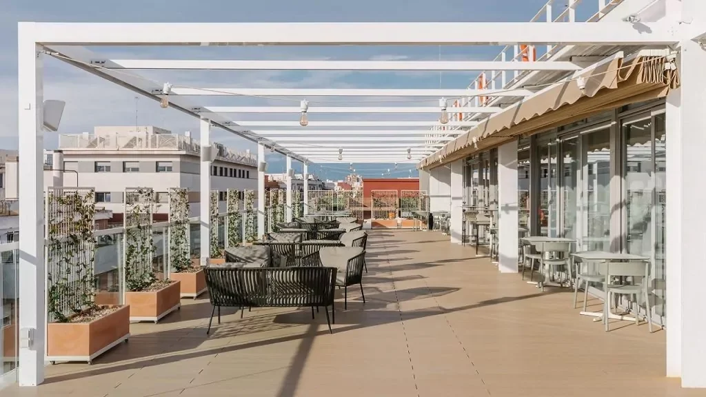 Wayco Cabanyal is a modern co-working space located just across the street from the student residence. The facility is open to students from 8:00 AM to 8:00 PM and provides a variety of comfortable study and gathering spaces. Amenities include two spacious rooftop terraces, large common areas, quiet study spaces, and a rooftop kitchen where students can heat and enjoy their own meals. The building also features a café where students can purchase lunch and other refreshments during the day.